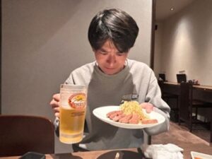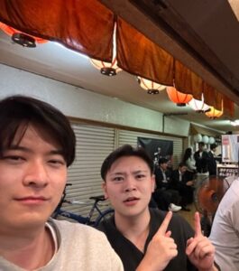気づけばお腹がすいてきました。懇親会に少しばかり参加し博多の街へ駆け出します。集合場所に日中とはテイストの違うかっこよさで茂木先生登場です。(このメガネ欲しい!)