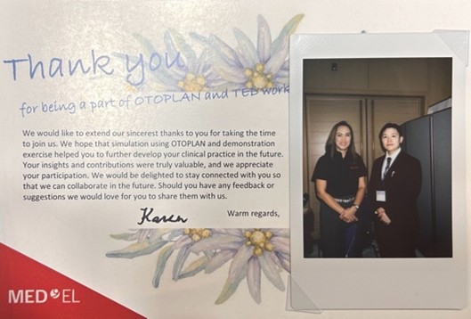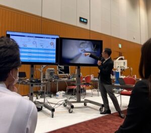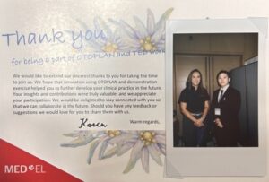 先生方の話を聞きながら合間に企業ブースを回ります。MEDEL社のOTOPLANハンズオン&電極挿入セッション参加後の写真ですが、いい感じなので載せておきます。