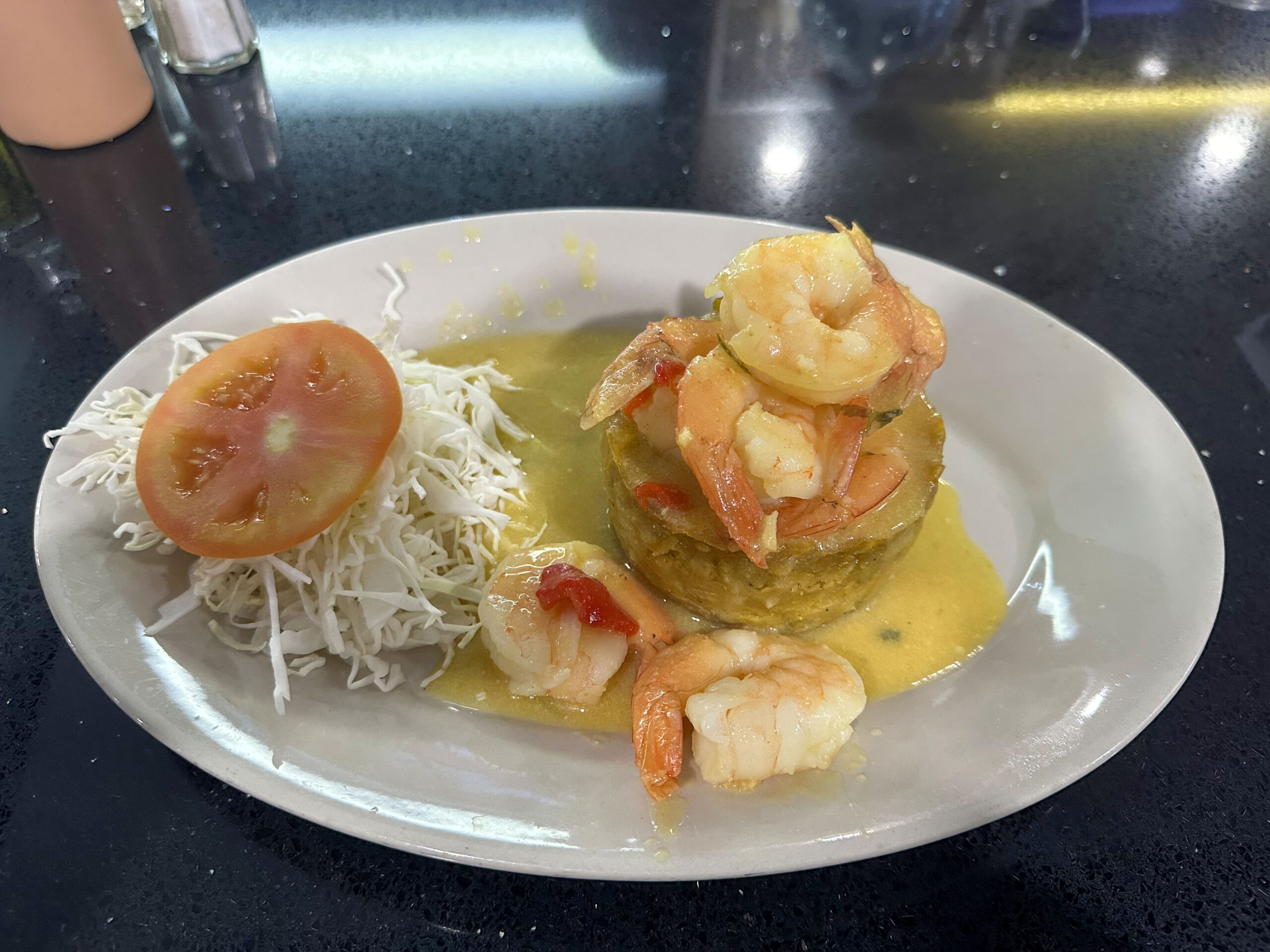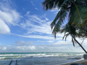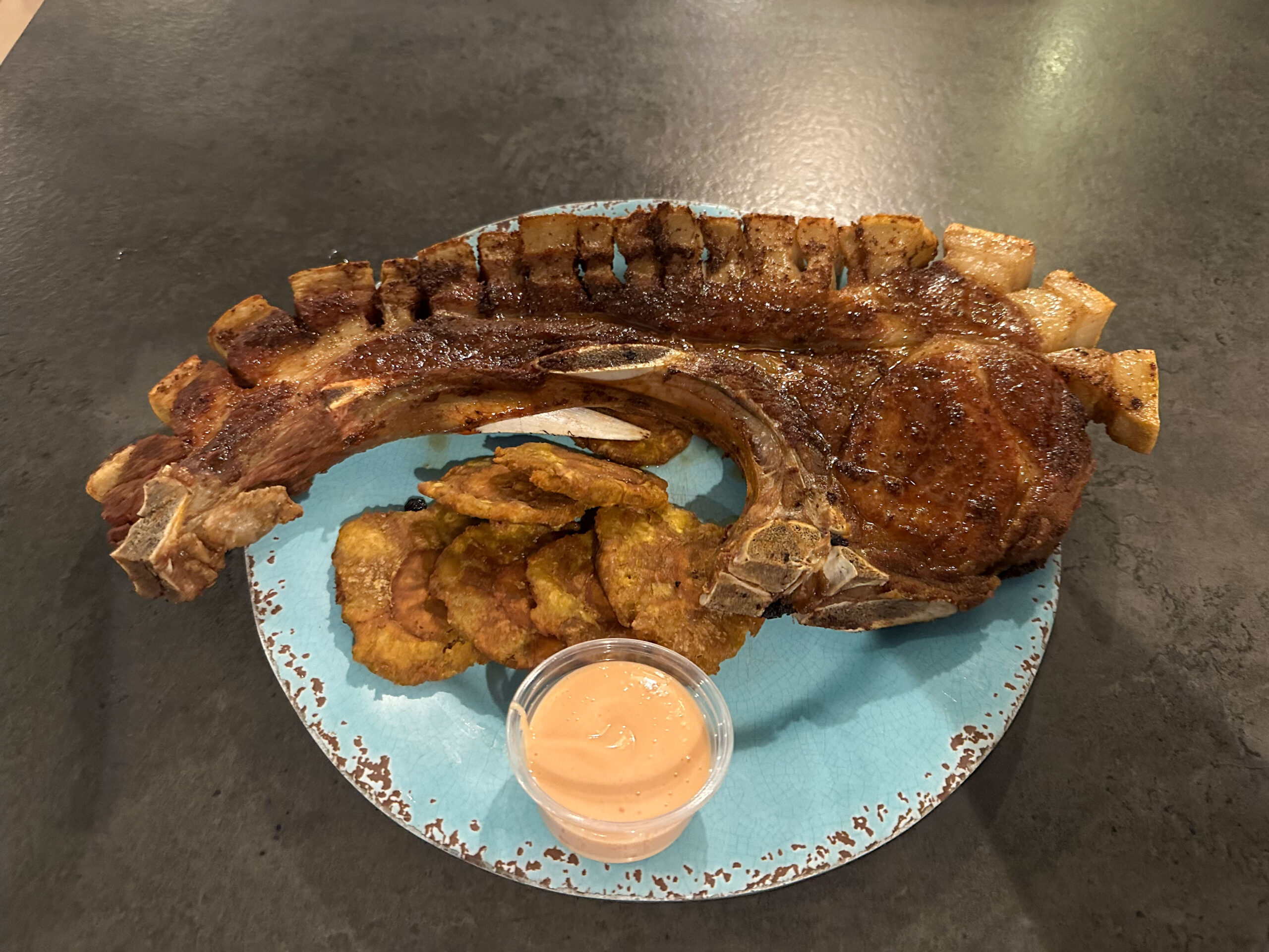 そして、お楽しみの食事!日本から合流した先生方とテーブルを囲み、プエルトリコが誇る食文化に舌鼓を打ちました。赤身肉の旨味が爆発する「チュラスコ」、そして見た目も味もまさに肉のトマホークな豚肉料理「チュレタ・カンカン(Chuleta Kan-Kan)」。プエルトリコのソウルフード、海老のMofongo(モフォンゴ)も絶品。なかなか日本では体験できない、野生味あふれる力強い味でした。
